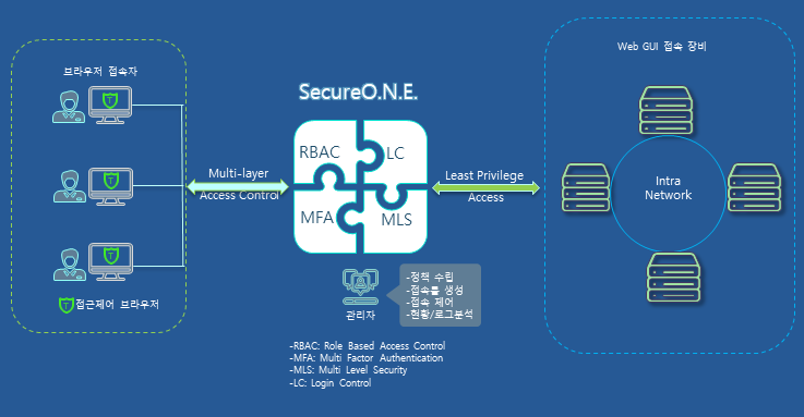SecureONE은 ZTN(Zero Trust Network) 환경에 적합한 웹 브라우저 접근제어 시스템으로써 다단계 검증을 통해 인증된 사용자들에게 최소권한(Least Privilege)이 부여 되도록 역할 기반 접근제어(RBAC: Role Based Access Control), 다중인증(MFA: Multi Facto Authentication)과 다중등급(MLS: Multi Level Security) 제어방식을 적용하여 신뢰할 수 있는 접근 제어 정책을 시행할 수 있다. SecureONE은 국내 최대 그룹사에 공급되어 기 구축한 CLI(Telnet/SSH) 기반의 접근제어 시스템과 함께 안정적인 운영을 통해 접근제어 솔루션의 기술력을 인정받고 있다. |