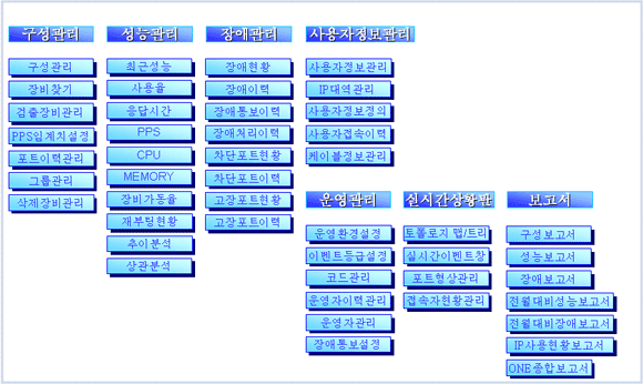 또한 네트워크 관리자는 O.N.E에서 제공하는 네트워크 정보 트리(Network Information Tree)를 이용하여 관리대상 장비들을 그룹별로 구성할 수 있으며, 이를 통해 구성관리, 성능관리, 장애관리 기능들을 쉽게 선택하여 수행할 수 있습니다.