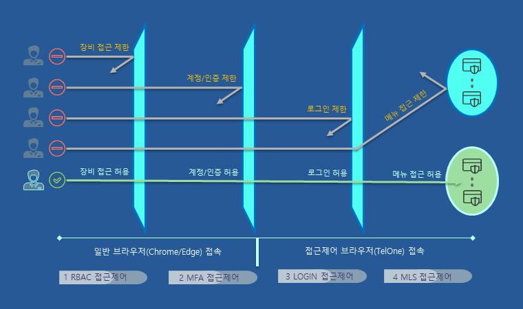 사용자가 접속화면에서 장비 접속을 시도할 때 계정 확인과 MFA인증을 통하여 장비 접근 허용 여부를 제어하며, 전용 브라우저(TelOne)에 의해 접속 장비의 로그인 화면이 출력된다.