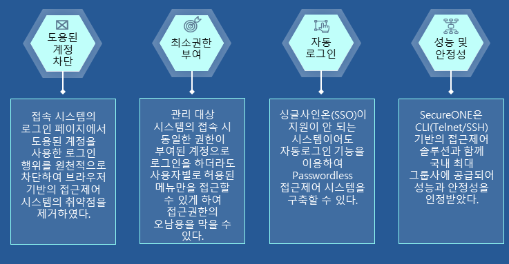 SecureONE의 차별화된 기능으로 접속 장비의 로그인 화면에서 사용자별로 발행된 계정으로만 장비의 로그인을 허용하여 탈취한 계정의 사용을 원천적으로 차단한다.