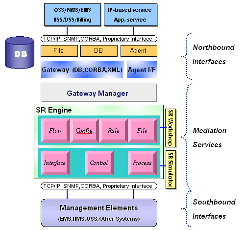 StreamRules/net은 Multithread(Object-Oriented)를 지원하는 강력한 룰 기반(Rule based)의 SR Engine과 망 연동을 위한 다양한 인터페이스(TMN Agent I/F, CORBA Gateway, DB Gateway, API)로 구성되며, SR Engine에 필요한 룰(Rule) 생성과 검증을 편리한 GUI에서 작업할 수 있게 하는 자바 기반의 SR Workshop을 제공한다.